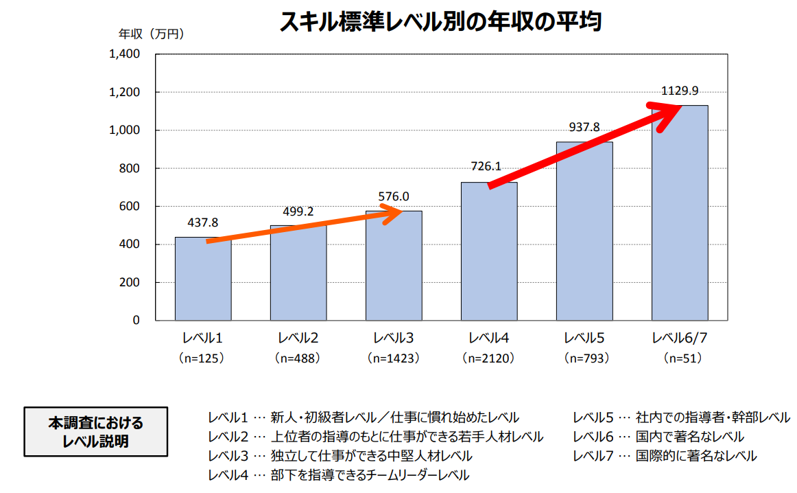 これまでの実績や成果に応じてレベル分けして、中途採用の給与を決定することもあります。例えばIT業界の場合、経済産業省の調査をもとにしたレベルごとの平均給与は、次の通りです。