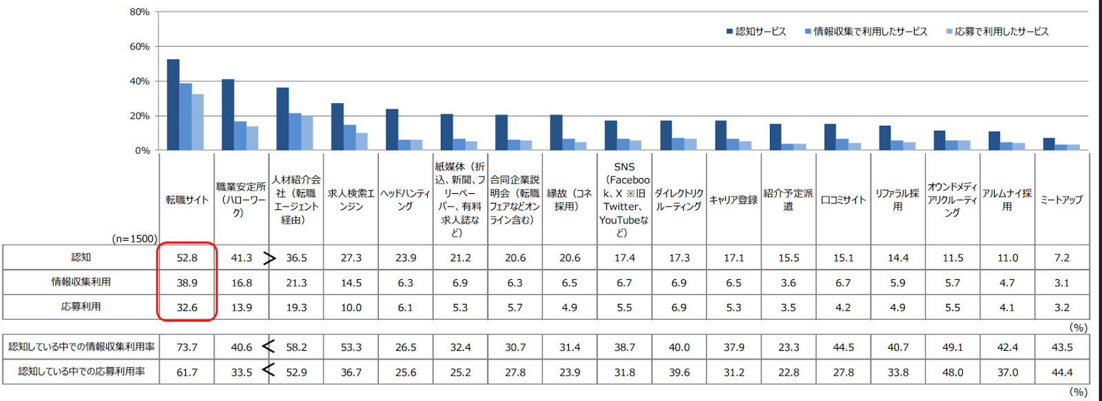 掲載媒体を選ぶ際は、認知度が高かったり、利用者数が多かったりする媒体を選ぶと、応募者が集まりやすくなります。マイナビが発表した 「転職動向調査 2025年版」 によると、認知度や利用者数の最も多い媒体は転職サイトでした。